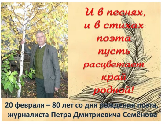 Заседание будет посвящено 80-летию со дня рождения нашего земляка, поэта и журналиста Петра Дмитриевича Семёнова. Будем рады видеть всех!