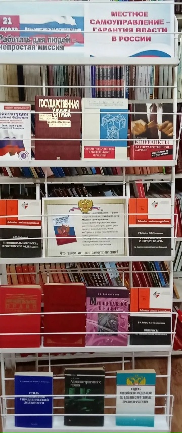 В центральной библиотеке работает книжная выставка - информация «Местное самоуправление – гарантия власти в России», которая поможет читателям больше узнать о теории муниципального управления, муниципальном маркетинге и кадровой работе в органах. На выставке представлены книги, рассказывающие об истории становления местного самоуправления в России и важности функций органов местного самоуправления. | |
