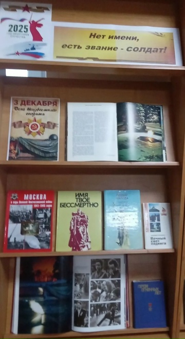 День Неизвестного Солдата — памятная дата в России, отмечаемая ежегодно 3 декабря. День неизвестного солдата – это возможность отдать дань памяти всем тем, кто погиб на войне ради мира и чьи имена не удалось установить. Память народа – залог его нравственной силы и духа. Поколение, которое предает забвению память предков, не имеет будущего. Ко Дню Неизвестного солдата в центральной библиотеке оформлена книжная выставка «Нет имени, есть звание - солдат!», на которой представлена документально-художественная тематическая литература. Читатели могут познакомиться с историей празднования Дня Неизвестного Солдата в России, подвигами солдат, отдавших свою жизнь за родную страну в годы Великой Отечественной войны, с памятником Неизвестному солдату. | |