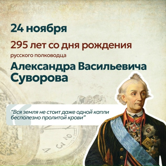 24 ноября 2025 года отмечается 295 - летие со дня рождения Александра Васильевича Суворова — великого русского полководца, патриота, военного теоретика, обладателя высшего воинского звания – генералиссимус, не знавшего поражений народного героя, принесшего славу Отечеству, своим примером показавшего, как надо защищать Родину.