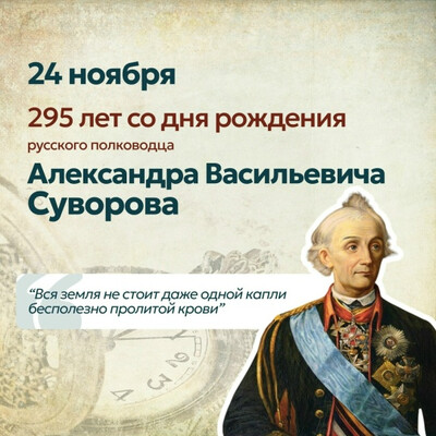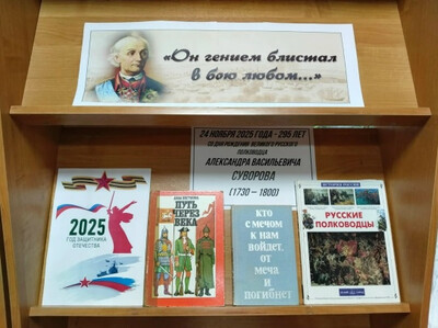 Александр Васильевич Суворов — один из самых выдающихся полководцев Российской империи. За свою службу он дал более 60 сражений и не проиграл ни одного из них, кроме боя во время осады Очакова. Суворов прославился победами в русско-турецких войнах, подавлением Пугачёвского восстания, блестящим Итальянским и Швейцарским походами 1799 года. За свои заслуги полководец был удостоен высшего воинского чина, став генералиссимусом России. Его книга «Наука побеждать» оказала огромное влияние на развитие российской армии. За 50 лет службы Суворов вёл исключительно наступательные операции и ни разу не участвовал в оборонительной войне. Поход 1799 года золотыми буквами вписан в историю российской армии. Легендарный переход Суворова через Альпы и сегодня поражает воображение. Павел I с восхищением констатировал победу Александра Суворова над самой природой. Покорение швейцарских горных вершин и длиннейший перечень предыдущих побед принесли полководцу прижизненную славу и звание генералиссимуса. В центральной библиотеке работает книжно – иллюстративная выставка «Он гением блистал в бою любом...». О нём написаны сотни книг, тысячи статей и научных монографий, сняты десятки фильмов. Его науку побеждать уже более 200 лет изучают в российских и зарубежных училищах и академиях. Его многие заповеди до сих пор не теряют актуальности, а многие стали крылатыми словами. Жизнь и служба Суворова – это великий роман, в котором много чрезвычайно интересного. | |