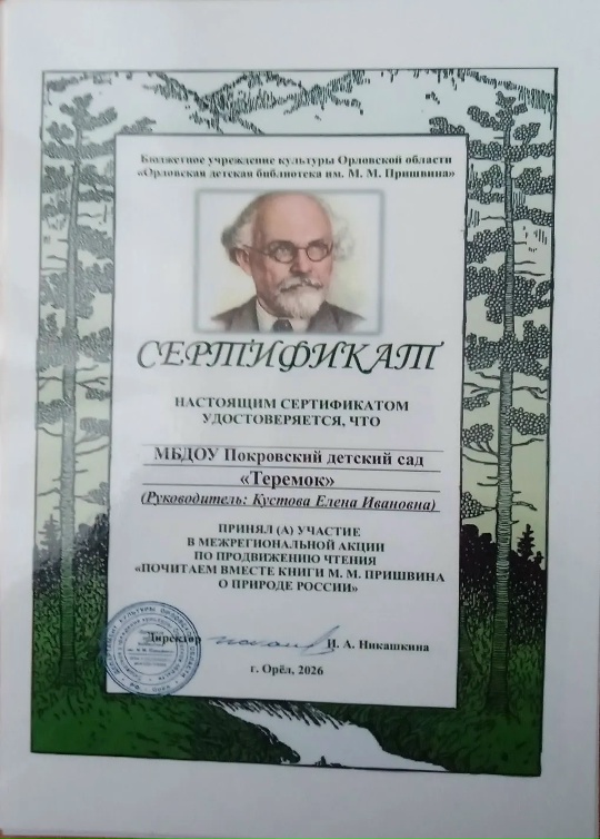 Сертификат участника акции «Почитаем вместе книги М. М. Пришвина о природе России» получили: МБДОУ Покровский детский сад «Теремок» и детская библиотека МКУК «Покровская межпоселенческая центральная районная библиотека им. С. Н. Оловенникова». Благодарим за участие! | |