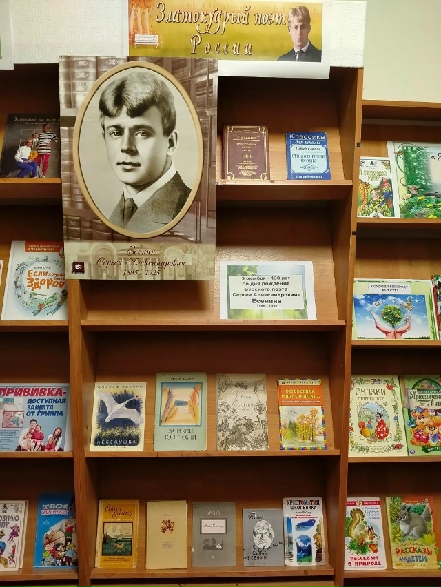 В преддверии 130-летнего юбилея С. А. Есенина, русского и советского поэта, писателя, одного из крупнейших представителей Серебряного века, в библиотеках Покровского района проводится комплекс мероприятий "Поэтическое сердце России - Сергей Есенин". В детской библиотеке работает выставка " Златокудрый поэт России", посвящённая жизни и творчеству С. Есенина. Проведён обзор. Библиотекарь Липовецкой сельской библиотеки провела вечер - портрет "Люблю тебя, Родина кроткая" с учащимися Перехоженской общеобразовательной школы. Познакомила детей с творчеством поэта. Ребята прочли стихотворения Есенина. К мероприятию была оформлена книжная выставка, проведён обзор.