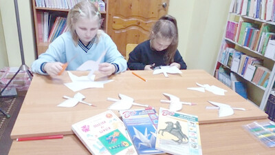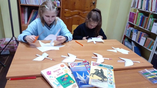 В преддверии Дня Белых Журавлей в библиотеке прошёл мастер - класс «Белый журавлик - символ памяти» по изготовлению бумажных журавлей. Белые журавли - красивый символ светлой памяти о павших на полях сражений. Сотрудник детской библиотеки Черных Т. А. провела мастер – класс по изготовлению бумажных журавликов. Юные читатели библиотеки изготовили бумажных журавлей и почтили память тех, кто положил свои жизни на алтарь Победы на полях сражений. Бумажные журавлики поселились на книжной выставке.