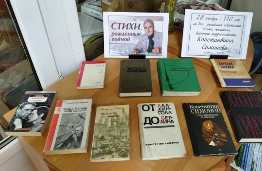 Симонов - Герой Социалистического Труда (1974), лауреат Ленинской и шести Государственных премий. Печататься начал с 1934 года. Участник боёв на Халхин - Голе. В годы Великой Отечественной войны корреспондентом «Красной Звезды» неоднократно выезжал на фронт. Автор поэм «Суворов», «Ледовое побоище», стихотворений «Жди меня», «Ты помнишь, Алёша, дороги Смоленщины», трилогии «Живые и мёртвые». Константин Михайлович – легендарный военный корреспондент, его творчество стало летописью целой эпохи. С первых дней Великой Отечественной войны Константин Симонов находился на передовой. Он работал в газетах «Известия» и «Красная звезда», и его очерки, стихи и репортажи помогали поддерживать боевой дух армии. В центральной библиотеке работает книжная выставка, приуроченная к юбилею писателя и поэта. Константин Михайлович Симонов, прошедший всю Великую Отечественную войну — личность удивительная, яркая. Его репортажи, стихи, сценарии, пьесы, роман «Живые и мёртвые» вошли не только в историю литературы, но и в историю войны, историю жизни не одного, а целого ряда поколений. Не было бойца, который бы не знал стихотворение «Жди меня». Солдаты вырезали стихи Симонова из газет, переписывали, сидя в окопах, заучивали наизусть и посылали в письмах жёнам и невестам.